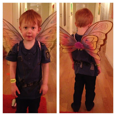 Här skådar ni en lycklig pojke som äntligen har fått ett par fe-vingar, eller älvvingar kanske det heter. Behovet har uppstått efter diverse älv-lekar på dagis och har intensifierats sen vi var på bio och såg den rafflande Tingeling och vingarnas hemlighet...